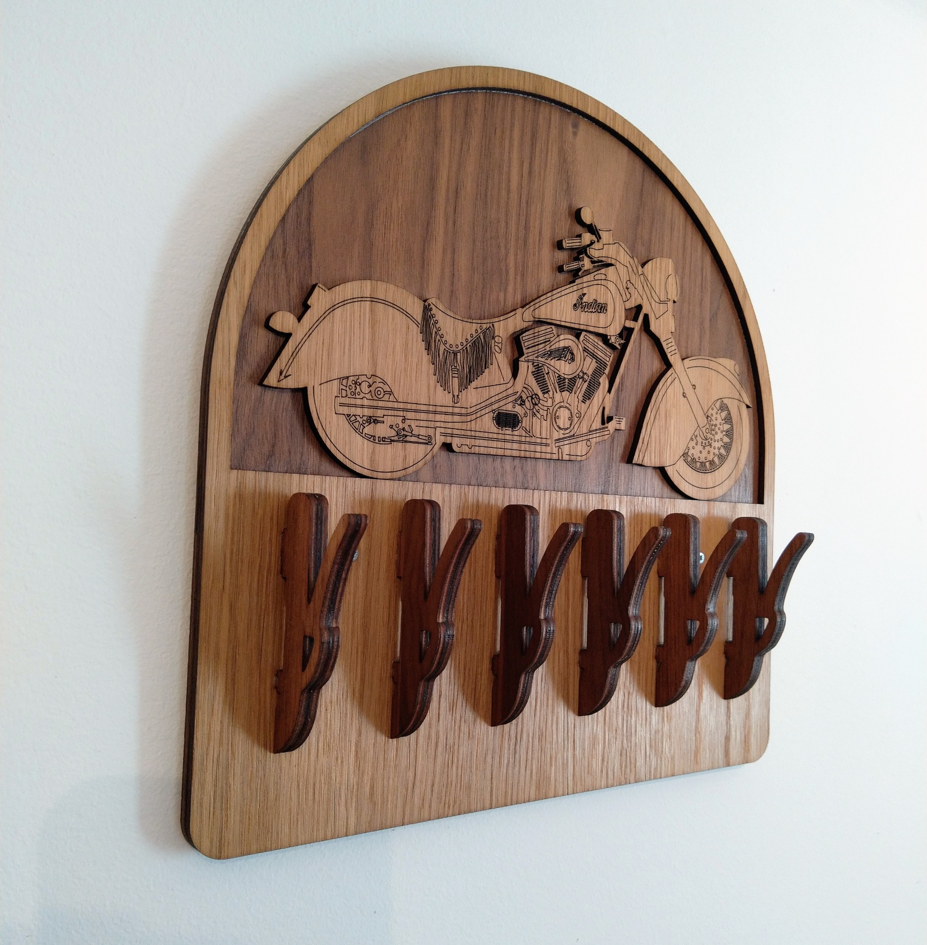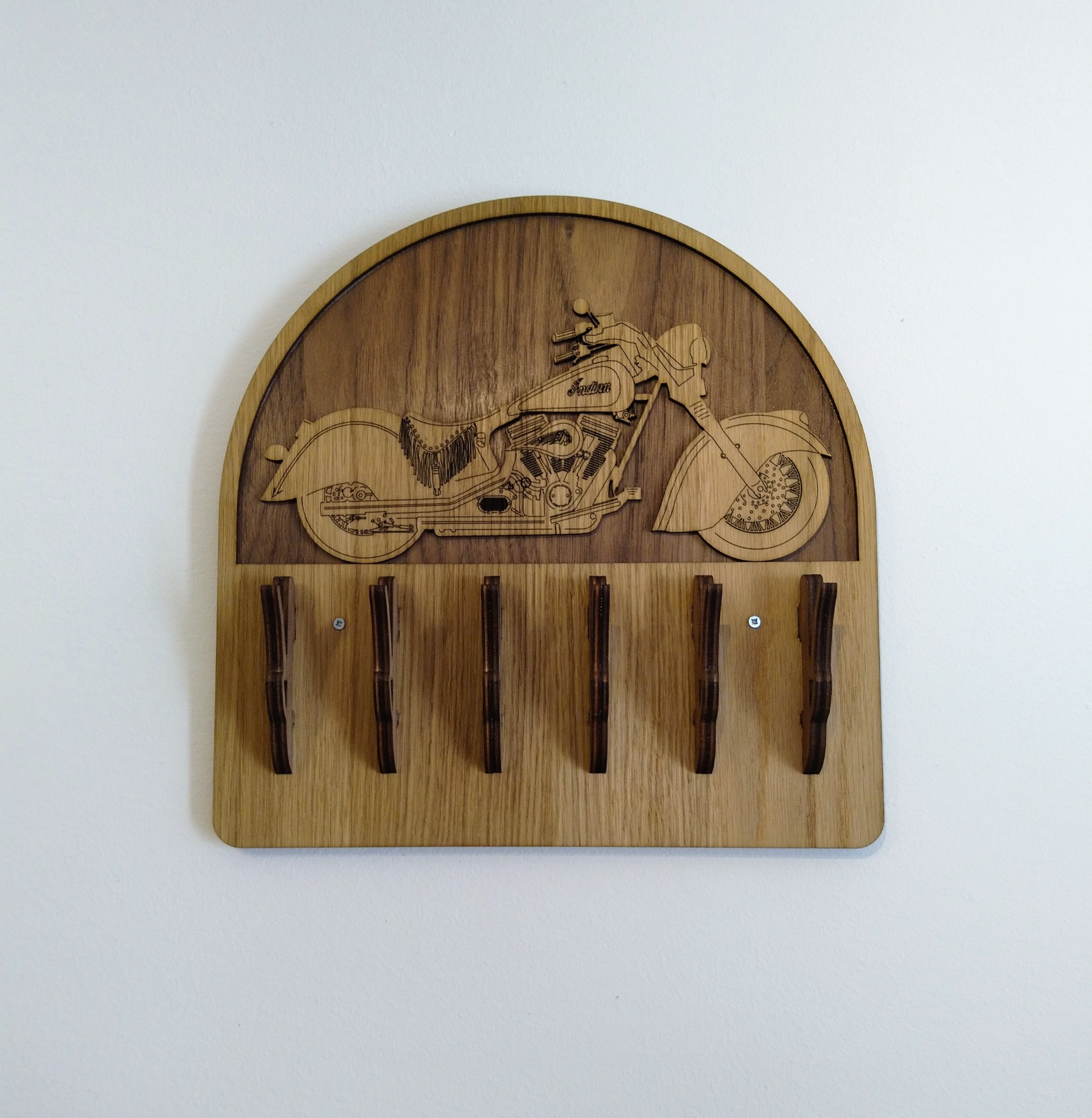Motoros mintával díszített prémium minőségű fa kulcstartó.
