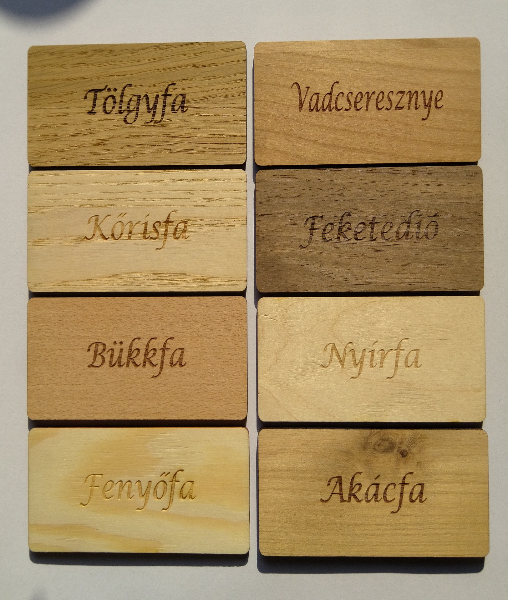 A nemes lombos rétegelt lemezből készült darabok, valódi tölgy, vadcseresznye, kőris vagy feketedió furnérral készülnek. A természetes fa erezete és a precíz gravírozás minden darabot egyedivé tesz, megjelenésében és tapintásában is kiemelkedik a hagyományos puhafa ajándéktárgyak közül.