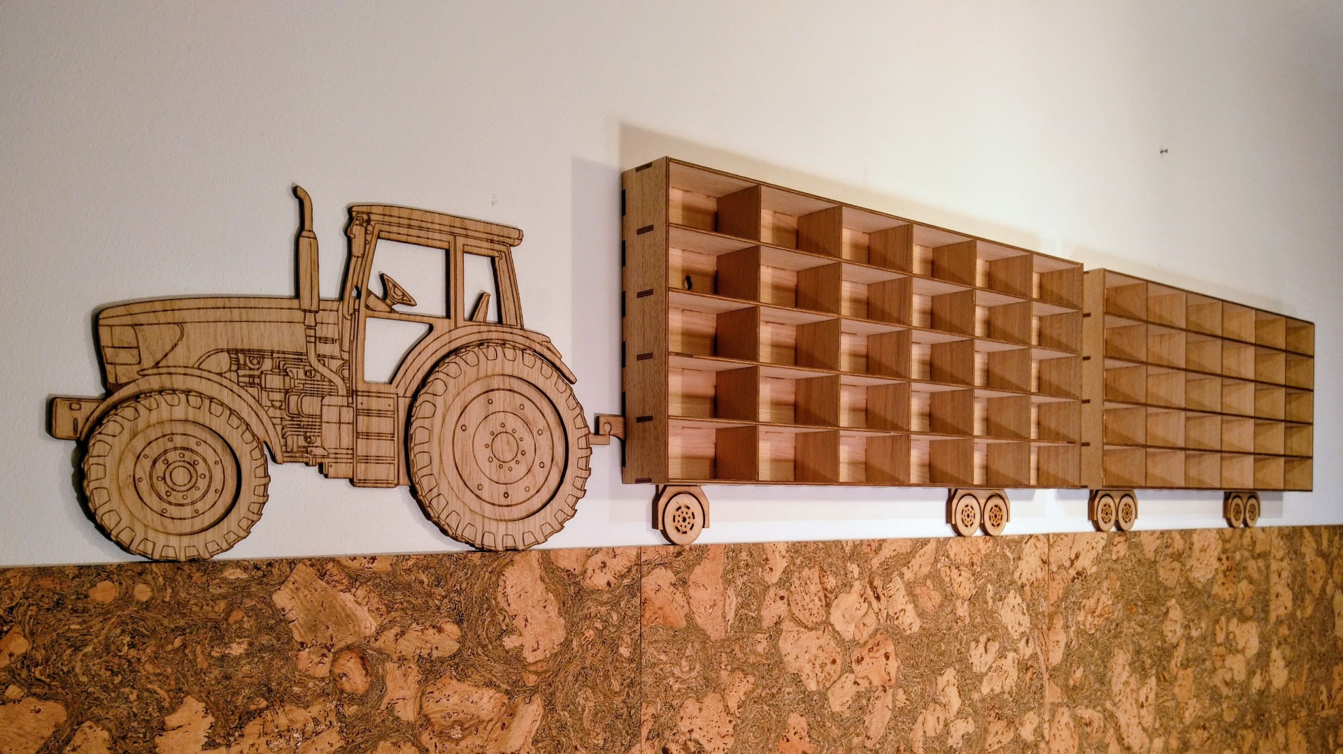 A traktor finoman kidolgozott vonalai, a kerekek és a karosszéria gravírozott részletei vizuálisan közelebb hozzák a valódi munkagépek világát, miközben megmarad a barátságos, mesés forma. Ez a polc nem csupán tároló, hanem falra kerülő élmény, amely ösztönzi a gyerekeket a rendszerezésre és a szerepjátékra is.
