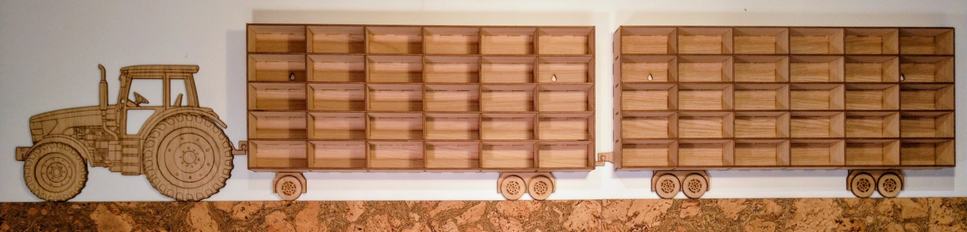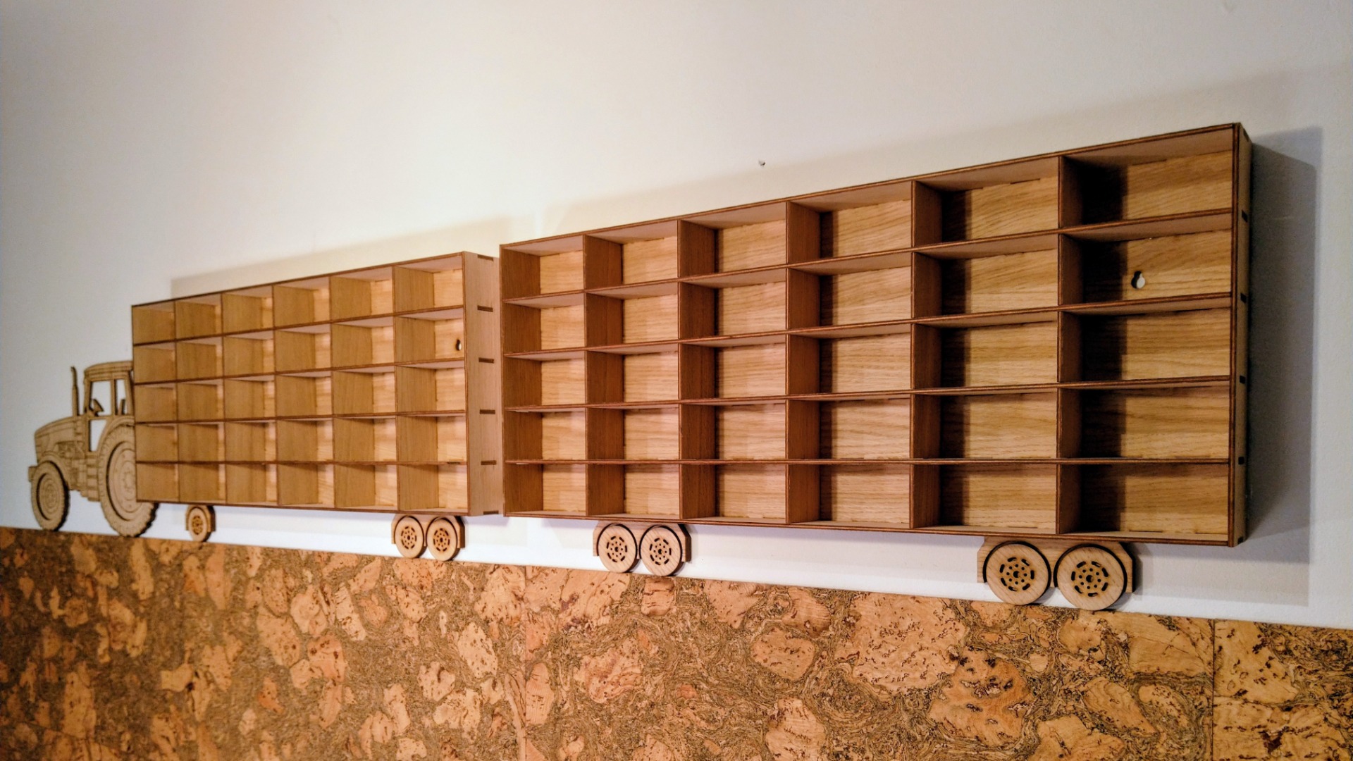 Ez a fa kisautó tartó polc a klasszikus traktoros gyerekpolc továbbgondolt, karakteresebb változata.