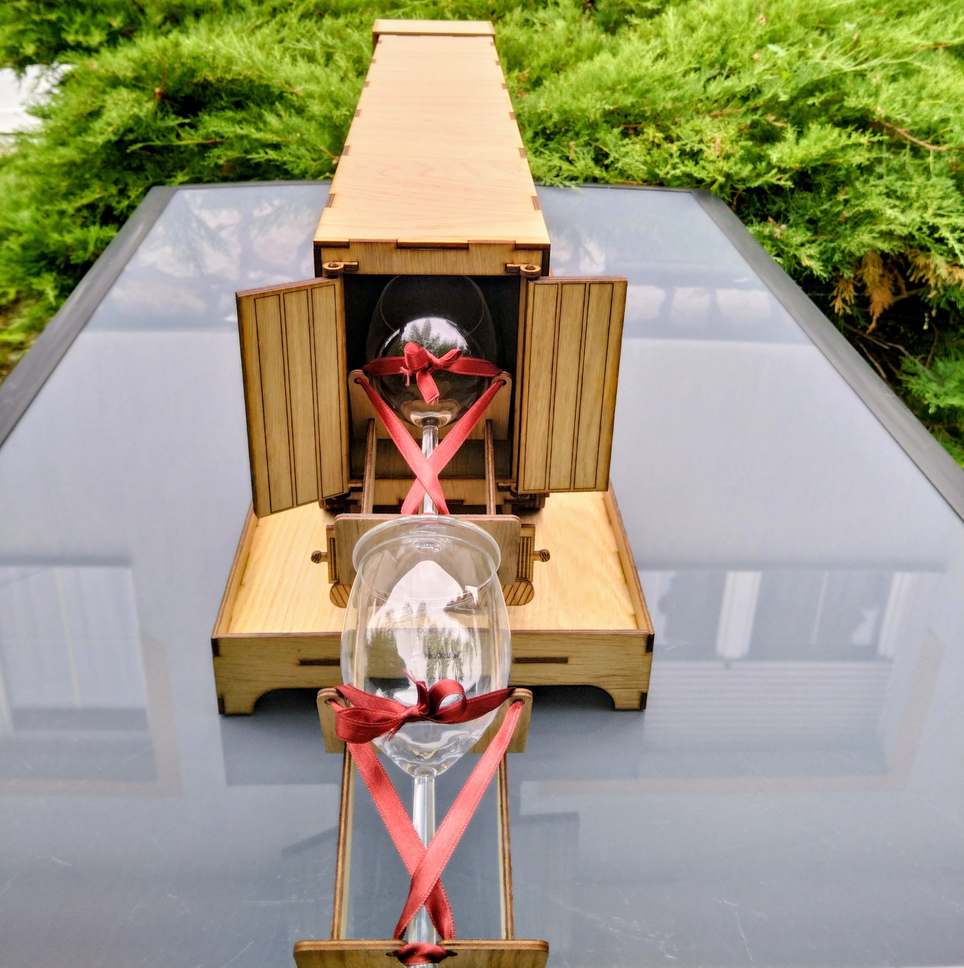 A makett kihúzható belső tárolóval rendelkezik, amely italok, poharak vagy egyéb ajándékok diszkrét, elegáns elhelyezésére szolgál.